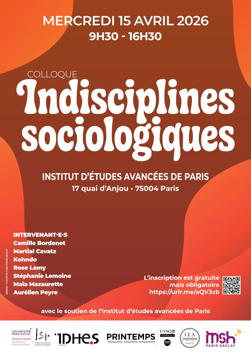 - [Colloque - ISP] Indisciplines sociologiques15 avril 2026Ce colloque réunit des romanciers/romancières, artistes, essayistes, journalistes… utilisant des travaux et théories sociologiques sans être eux-mêmes/elles-mêmes sociologues. Il s’agit d’explorer les usages de la sociologie « hors les murs », ou l’indiscipline sociologique (au double sens d’emplois hétérodoxes, et de sortie des logiques disciplinaires). La parole des usagers/usagères de la sociologie est au cœur de cette rencontre. Lire la suite